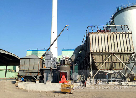 合格的石灰石塊料通過鏟車送入原料斗,經(jīng)手動插板閥進(jìn)入底部的皮帶機(jī),并通過提升機(jī)輸送至立磨。物料從進(jìn)料口落入磨盤中央,在離心力的作用下,物料從磨盤中央向邊緣均勻移動,經(jīng)過磨盤上的粉磨輥道區(qū)域時,受到磨輥的碾壓,大塊物料直接被壓碎,細(xì)粒物料受擠壓后形成料床進(jìn)行粒間研磨。被研磨的物料繼續(xù)向磨盤邊緣移動,直到被風(fēng)環(huán)處的強(qiáng)氣流帶走,而較大的顆粒物料又重新掉落到磨盤上繼續(xù)研磨。氣流中的物料經(jīng)過上部的分析機(jī)時,在分析機(jī)的作用下,粗顆粒重新回到磨盤上粉磨,合格的細(xì)粉隨氣流一起出磨。細(xì)度合格的細(xì)粉出磨后進(jìn)入脈沖收塵器,并通過底部出料口之間的鎖風(fēng)閥進(jìn)入倉泵進(jìn)行輸送?;烊胛锪系蔫F塊等雜物隨物料運(yùn)動到磨盤邊緣時,由于自身重量大而不能被風(fēng)吹起,跌落至磨機(jī)下腔,從排渣口排出機(jī)外。