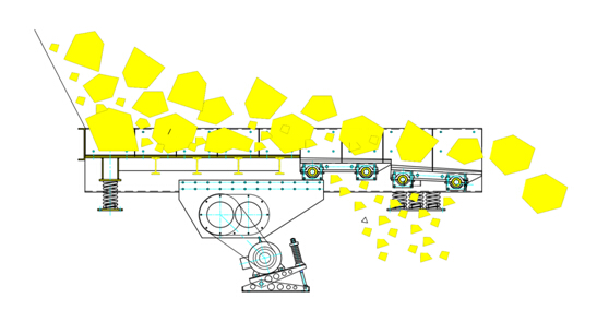 TSW給料機(jī)慣性式雙偏心軸激振器能產(chǎn)生定向激振力。兩軸之間有一對傳動比為1的齒輪副連接,保障其回轉(zhuǎn)方向相反,轉(zhuǎn)速相等。通過電動機(jī)驅(qū)動,兩偏心軸旋轉(zhuǎn),由于兩軸上的偏心質(zhì)量和偏心距大小相等,所產(chǎn)生的慣性力在一個方向互相抵消,而在另一個方向互相疊加,從而合成的定向激振力,使與此激振器剛性連接的給料槽體在支承彈簧上做強(qiáng)制振動,物料在振動力的作用下,在料槽上作滑動及拋擲運(yùn)動,從而使物料前移而達(dá)到給料目的。當(dāng)物料通過槽體上的蓖條時,較小的物料通過蓖條之間的間隙落下,不再經(jīng)過破碎而直接進(jìn)入下道破碎工序,從而起到預(yù)篩分效果,充分保障破碎設(shè)備的破碎效率及能力。